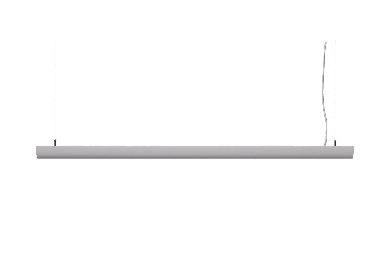 The Boring Light is a 1500mm long, 150mm wide pendant light with a rounded bottom side, designed to meet all UGR norms. It provides both uplighting with tuneable white and downlighting at 3000 Kelvin. The fixture features a tuneable grey color and is compatible with DALI control systems, offering reliable and adjustable illumination for various environments.